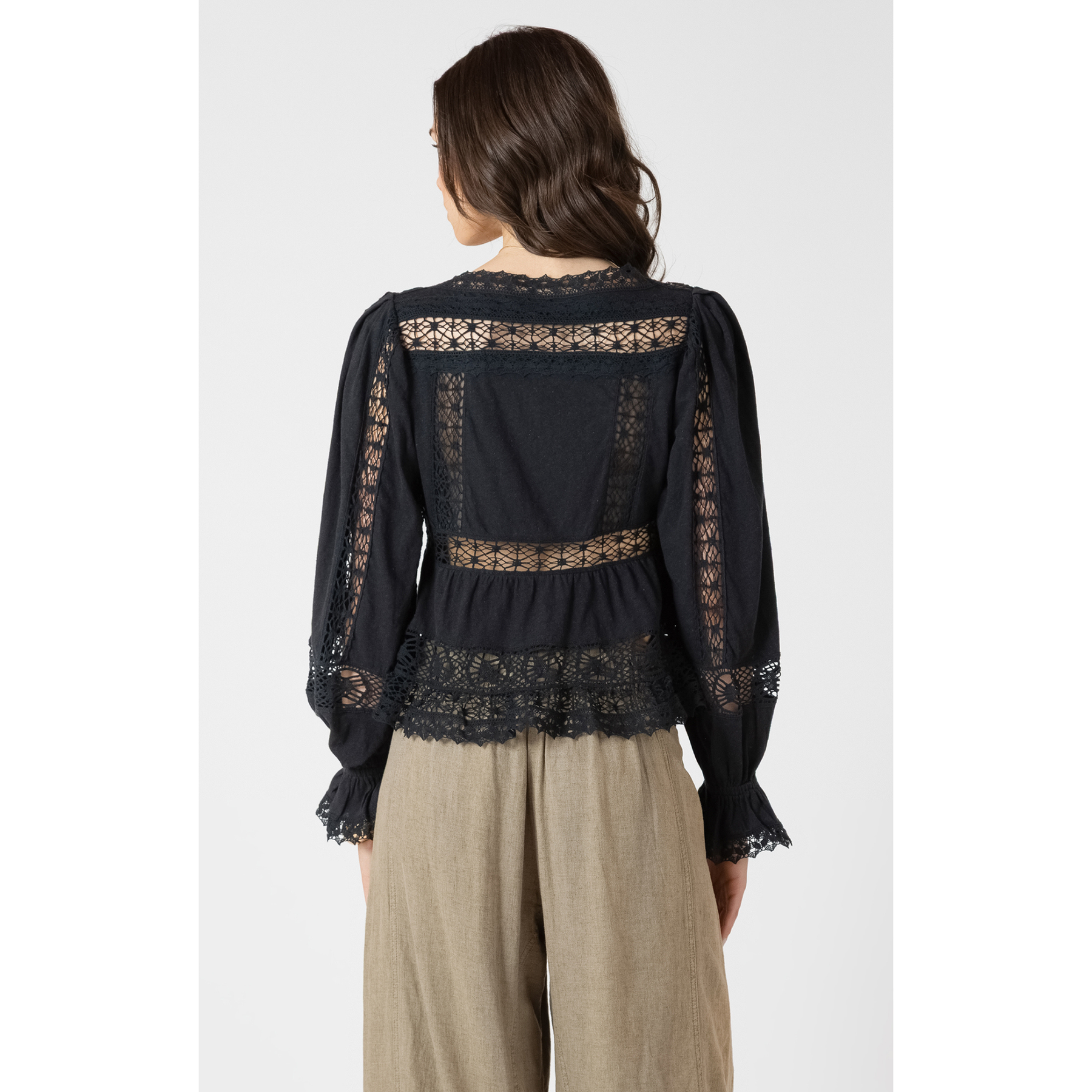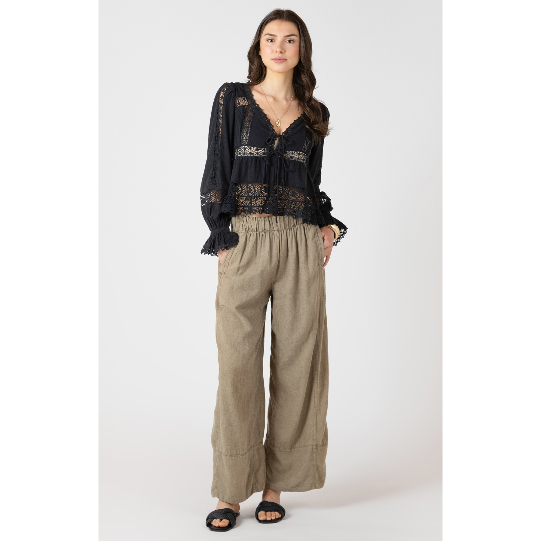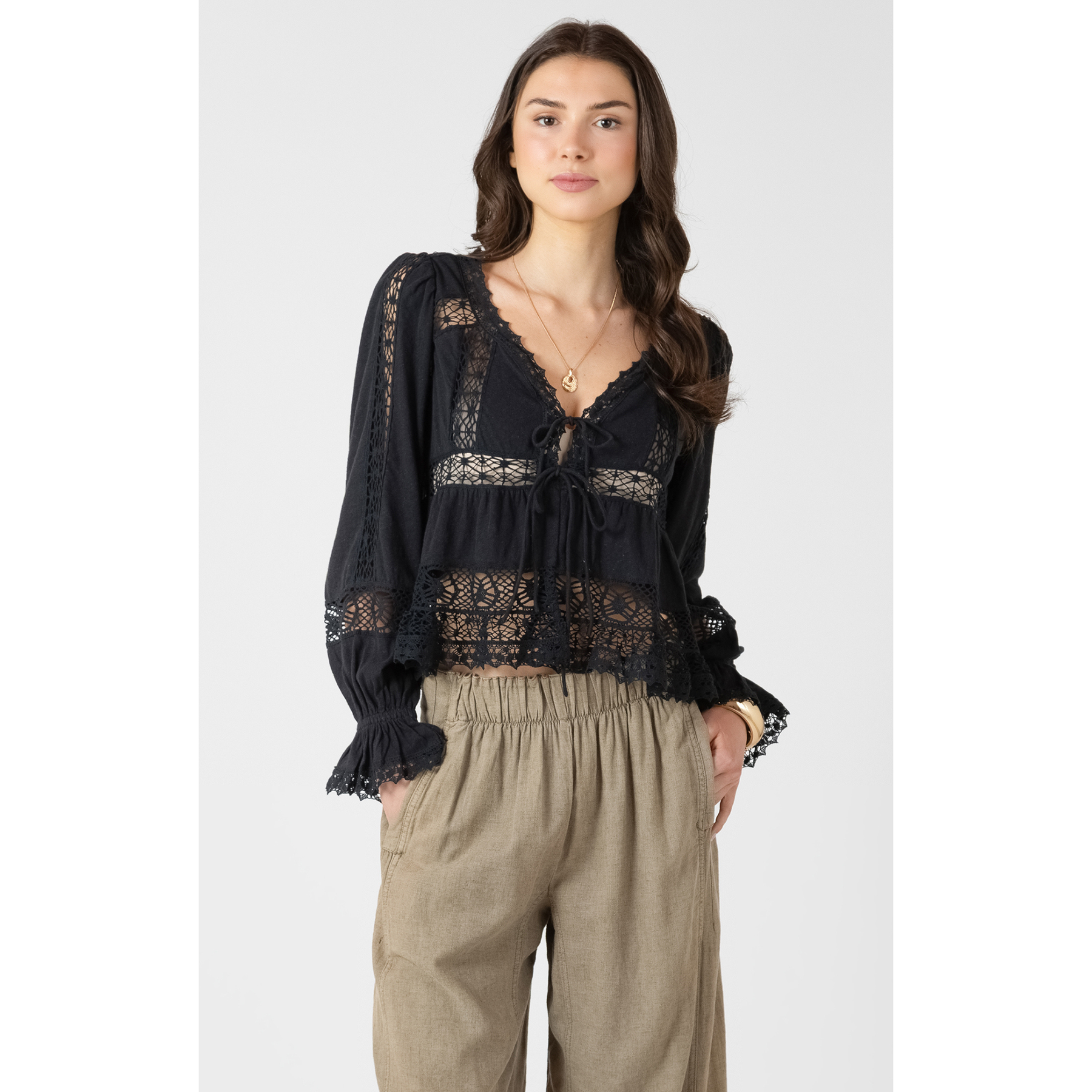 Modern and romantic, this DEX top features sheer lace detailing and a flattering tie-front design. An elevated statement piece with a soft, feminine edge.